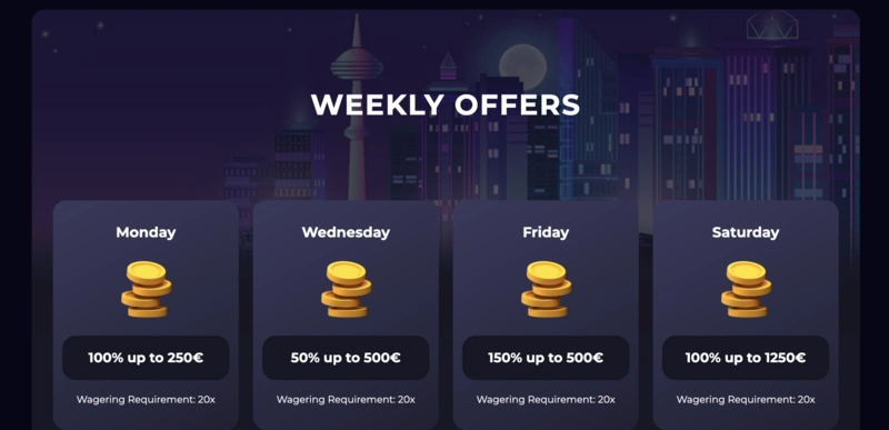 Once you’re past the intro phase, we keep things moving. On Mondays, reload with a 100% top-up. Hit midweek with a 50% Wednesday bonus, then wrap the week strong with a 150% Friday reload. All regular promos carry a simple 20x rollover and trigger instantly on qualifying deposits.